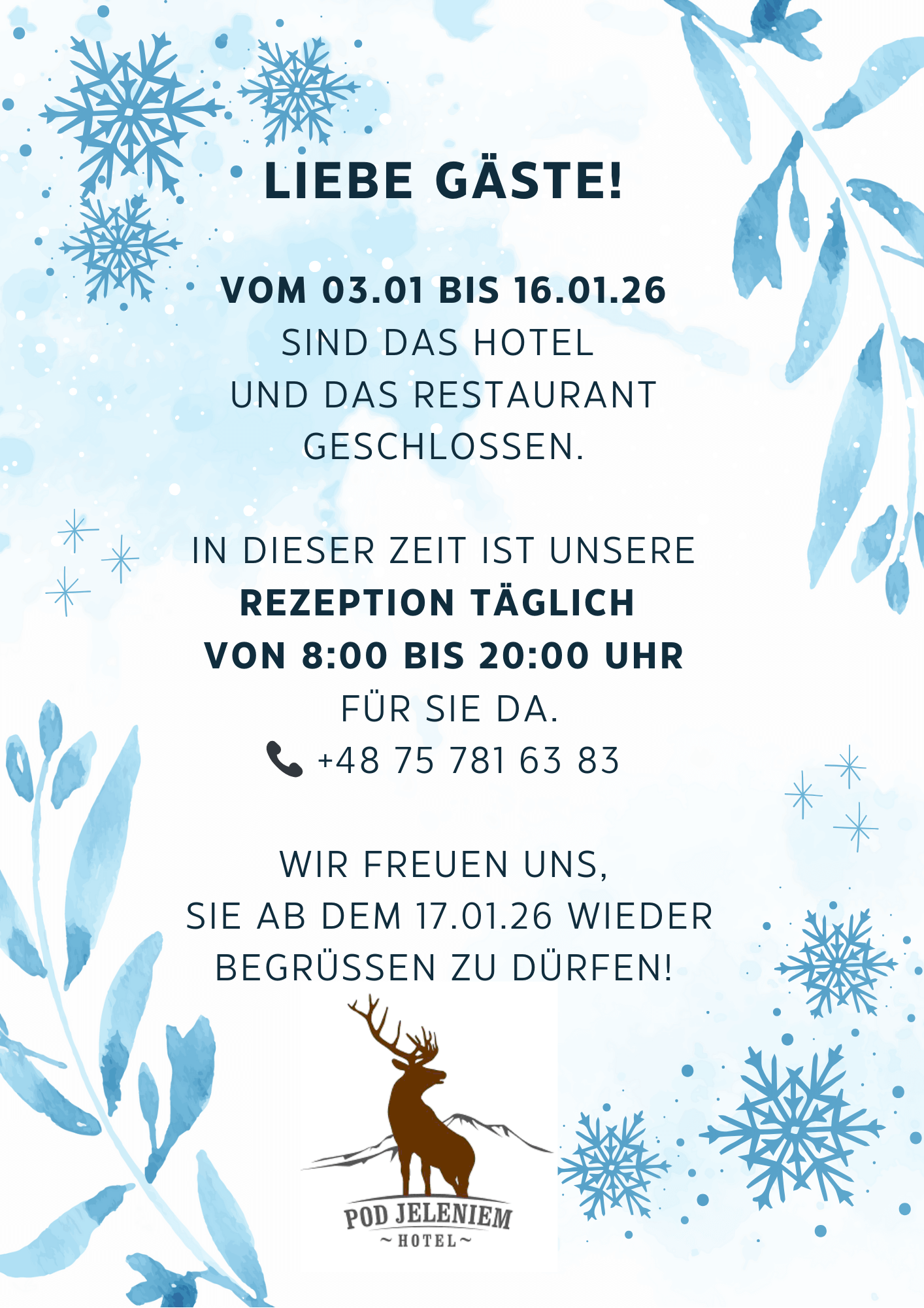 Wir freuen uns, Sie ab dem 17. Januar 2026 wieder bei uns begrüßen zu dürfen.